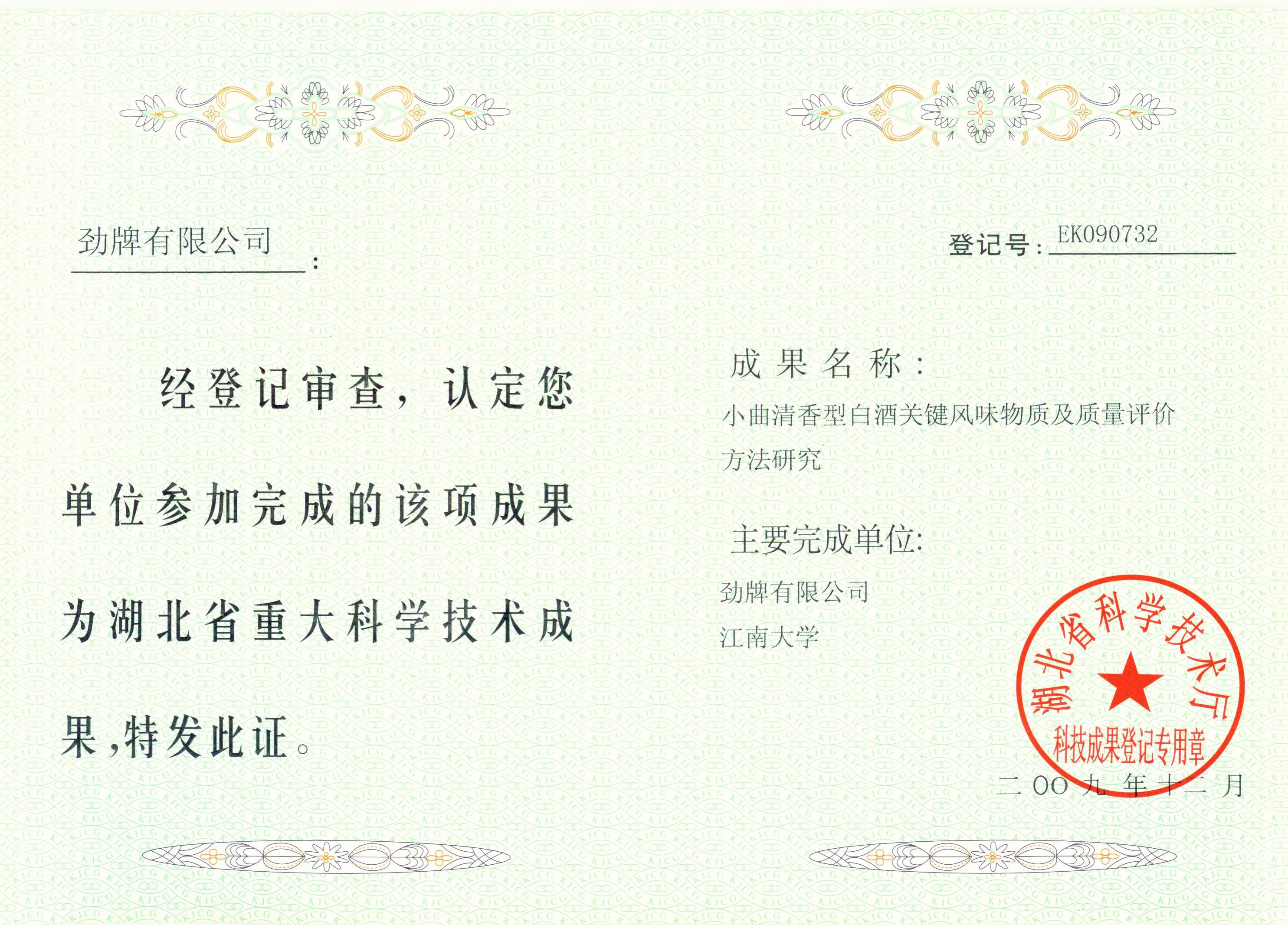 近年來,公司圍繞保健酒、草本白酒和中草藥新產品研發、產品改進和基礎應用技術,在中藥數字化提取、小曲酒釀造新工藝、中藥指紋圖譜等核心技術方面擁有自主知識產權,通過行業協會等鑒定機構技術評估22項,其中15項成果鑒定為“國際領先”水平,7項成果鑒定為“國際先進”水平。